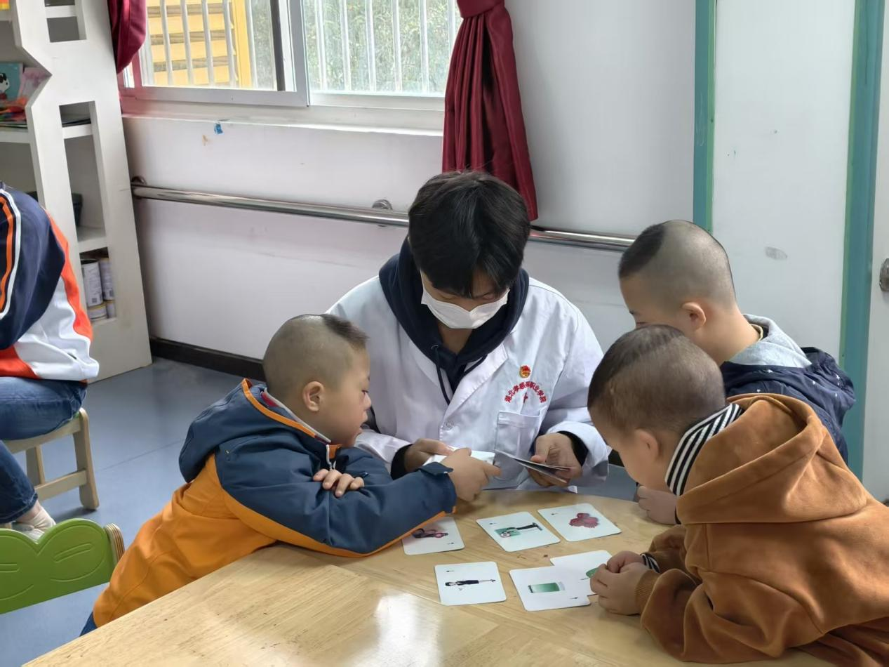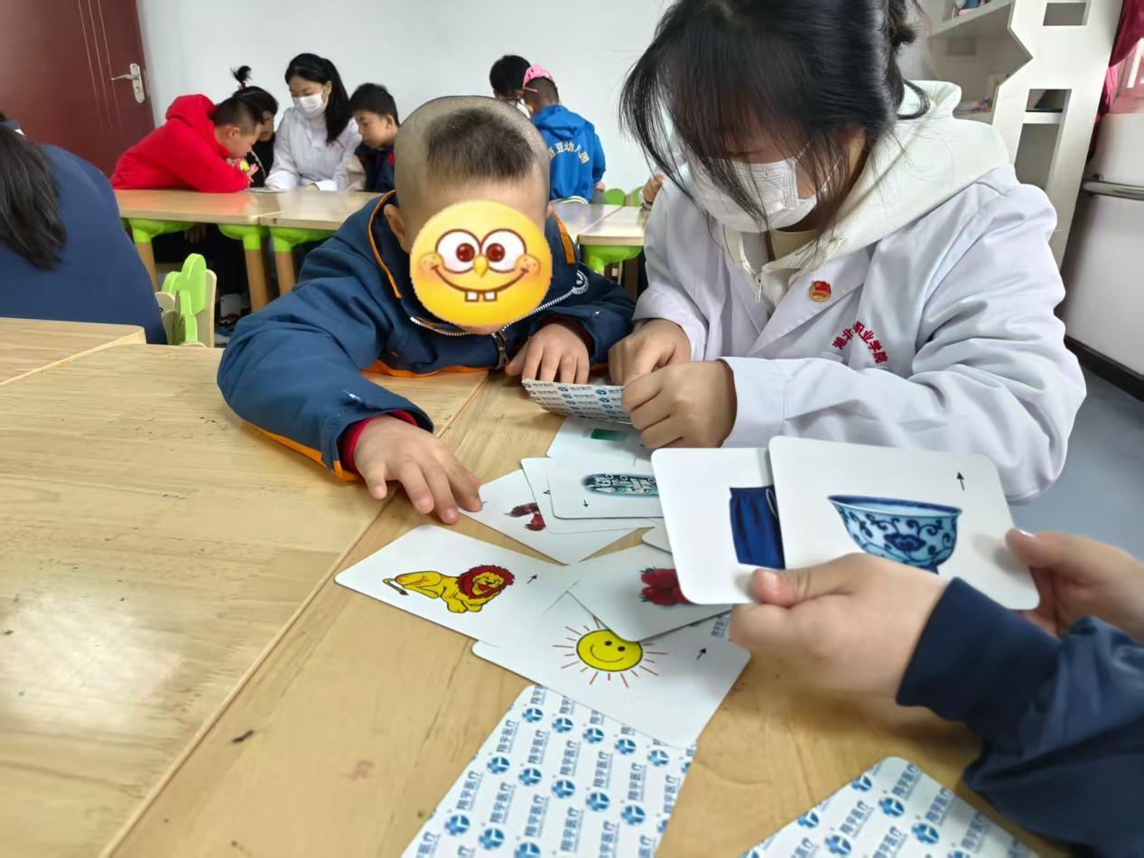 在言语治疗区,副会长孙悦涵、书记李雪涵、宣传部郝英焱化身“启蒙导师”,手持动物、物品认知卡片,耐心引导孩子们认读。志愿者们俯下身,用温柔的语调鼓励孩子开口。从最初的羞涩躲闪,到后来主动指着卡片喊出“狮子”“汽车”,孩子们在一次次互动中突破自我。每一次准确的认读,每一个勇敢的表达,都被志愿者们用镜头和真心记录下来——这不仅是语言认知的进步,更是童心与善意的双向奔赴。
