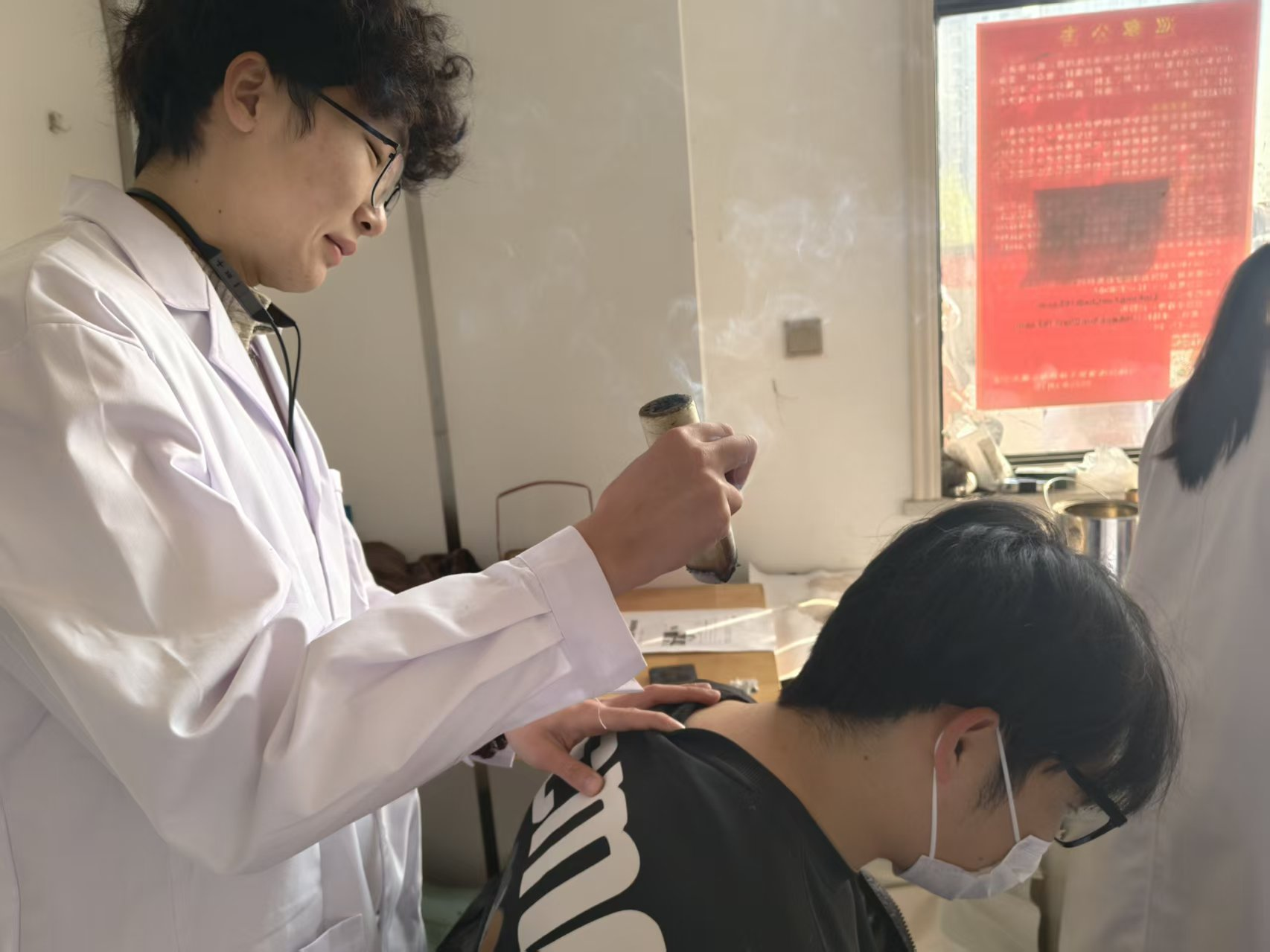耳穴压丸环节中,同学们精准定位对应穴位,为有失眠、头晕、消化不良以及颈椎、腰椎不适等困扰的群众进行调理,提供便捷的居家保健方案。