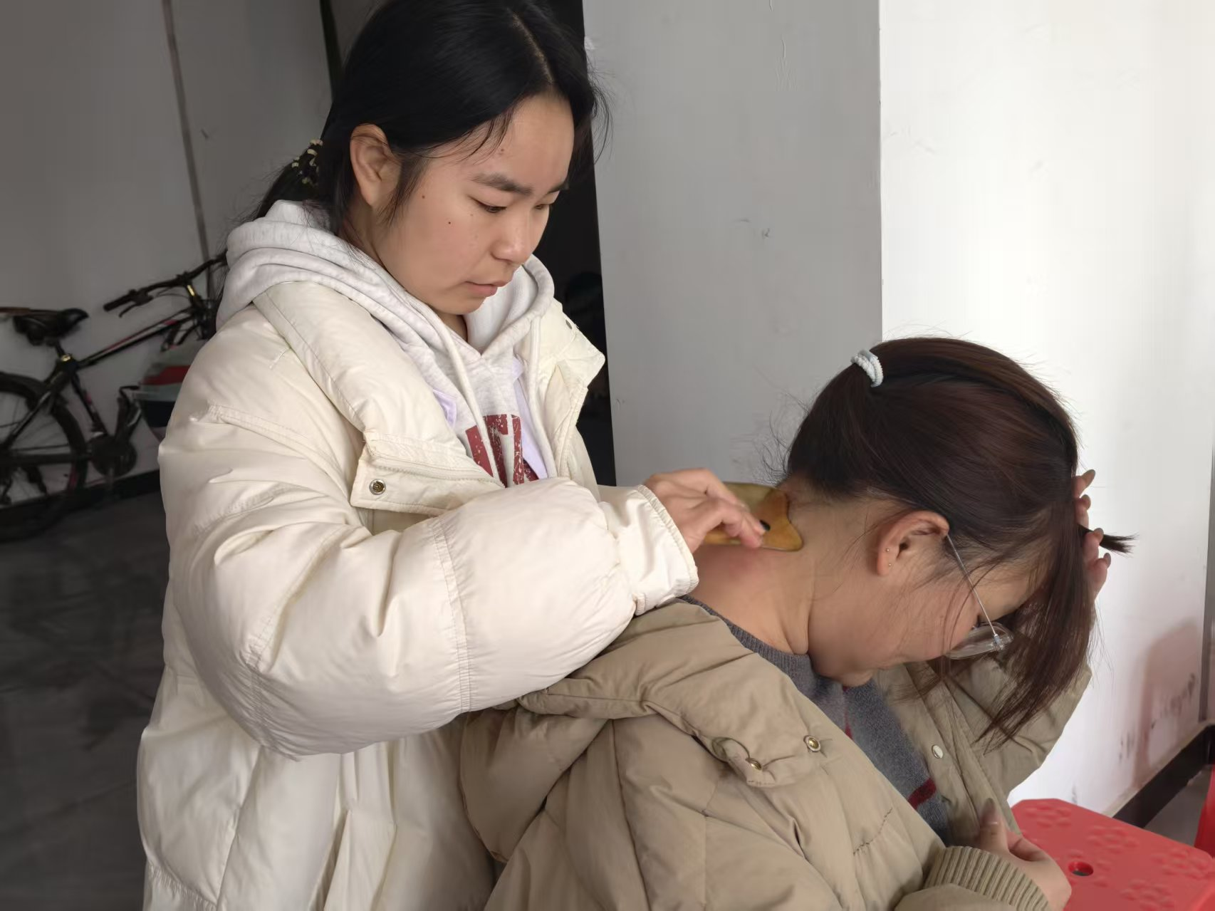 针对上火、咽喉不适、肌肉酸痛等问题,同学们采用专业的刮痧手法,在居民的颈部、背部等部位进行操作,通过疏通经络来调节身体状态。“刮完之后喉咙不那么干了,整个人都清爽了!”刚体验完刮痧的李阿姨说道。
